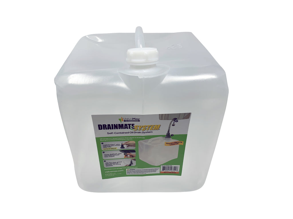 Fast, easy, and clean oil draining and disposal. More than 3,000 sold and counting, the ValvoMax Oil Drain Bag pairs perfectly with the Quick Twist Oil Drain Valve for the fastest, easiest, and cleanest way to change your oil at home. Connect the drain tube to the drain bag for easy oil draining and capturing. The clear oil drain bag holds up to 10L or 20L of used motor oil. Designed for use with the ValvoMax Oil Drain Valve and the Drainmate System. Accepted for recycling at most auto retail stores.